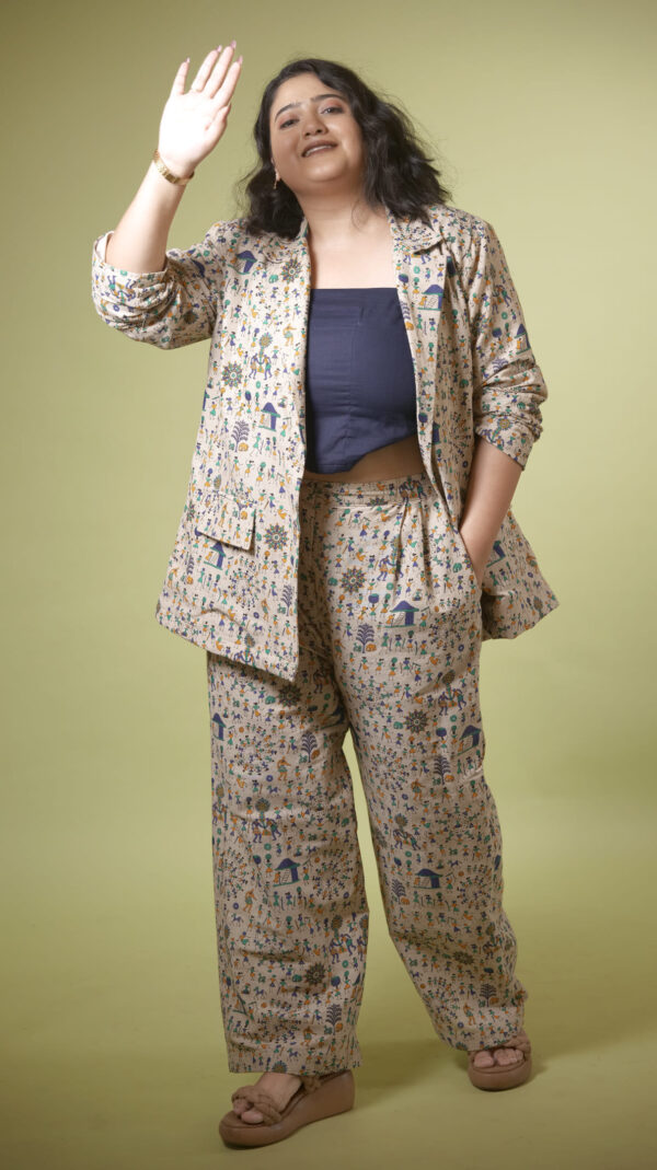 2pc include waistcoat and relaxed-fit trousers combo features stunning Devnagri text print adding a touch of indie to formal wear. Made of cotton.
